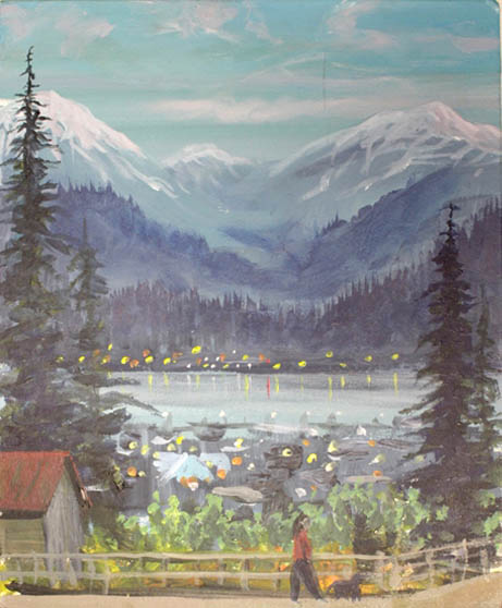 Laurence is widely regarded as Alaska’s most prominent painter, famous for his many views of Mt. McKinley, now known as Mt. Denali, and the Cook Inlet region. It is less widely known that Laurence visited and painted in Juneau, and his work was represented by Belle Simpson and the Nugget Shop. Journeying to Alaska in 1904 to prospect for gold, his artistic talent and fascination with Alaskan scenes brought him back to painting, where he began earning his livelihood and a lasting reputation.